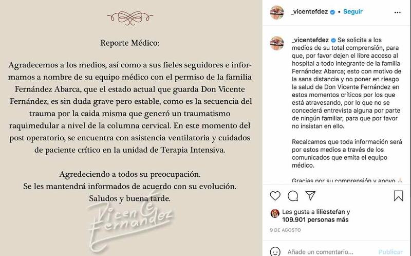 Además, reportaron que don Vicente Fernández seguía en terapia intensiva, despierto, con una traqueostomía y que se le alimentaba por medio de una sonda. Anunciaron que la recuperación de su movilidad sería muy lenta.