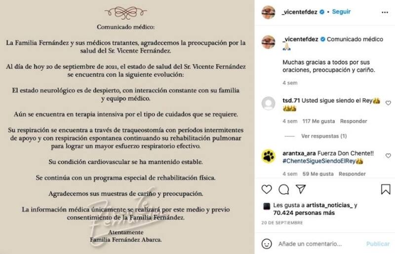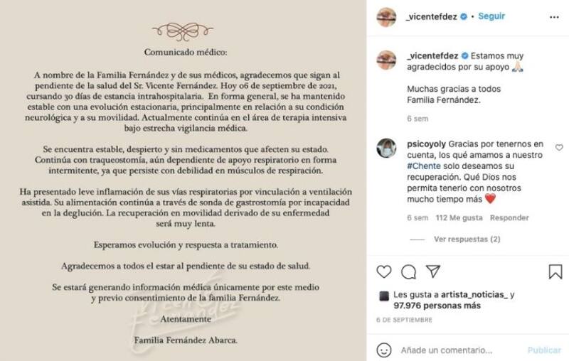 En el comunicado médico oficial compartido en la cuenta oficial de Instagram del ídolo de regional mexicano, se da a conocer la información oficial, se dice que "Don Vicente Fernández continúa estable, más alerta y cooperador en la terapia de rehabilitación. Su esfuerzo respiratorio continúa siendo débil por lo cual requiere soporte en forma intermitente".