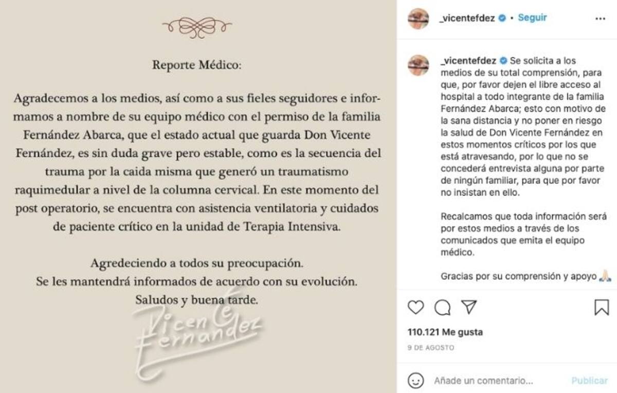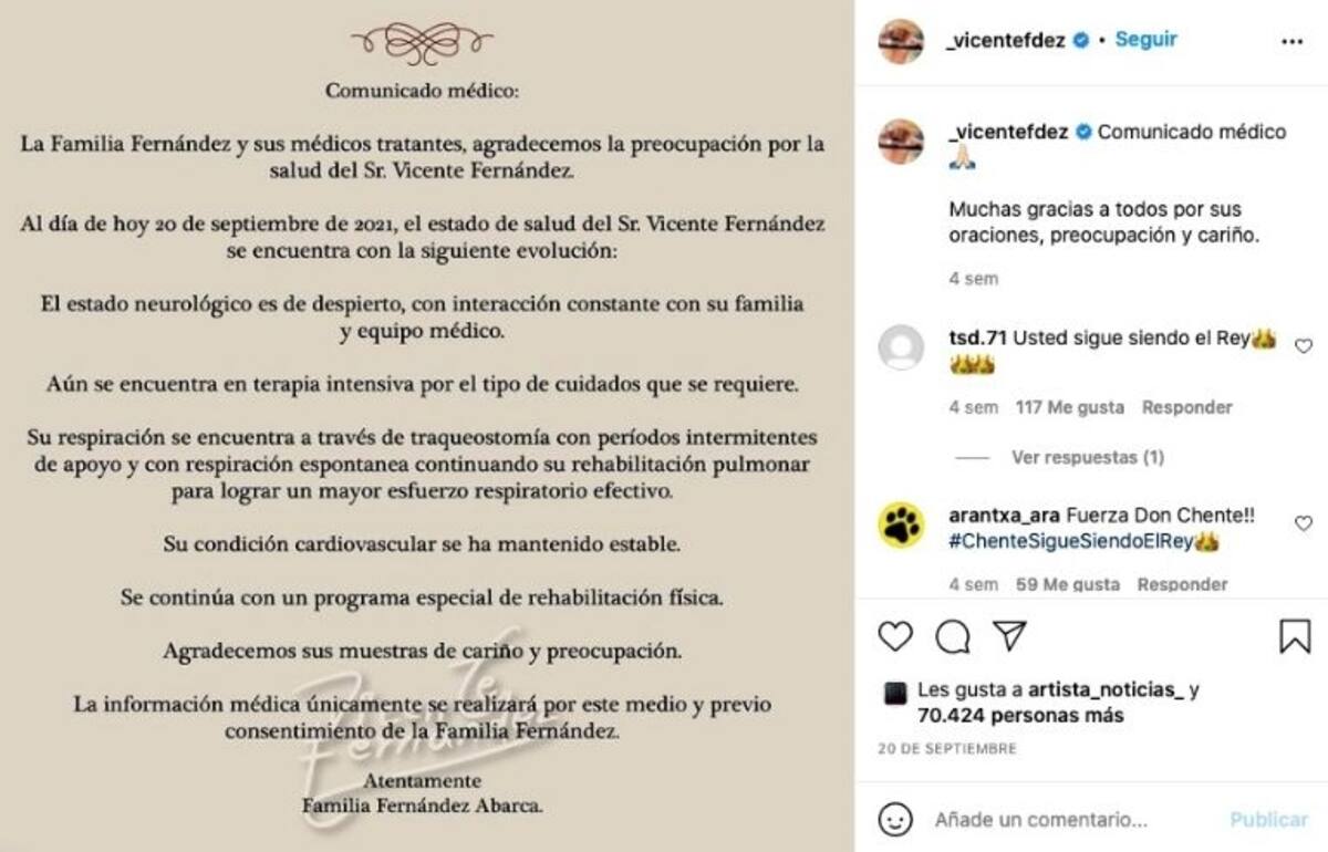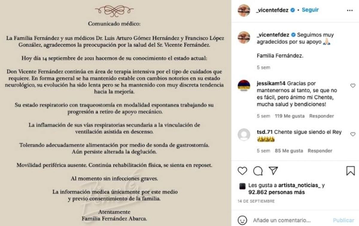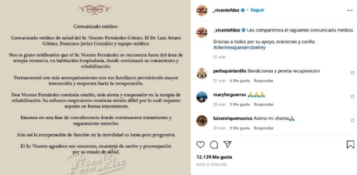 En el comunicado médico oficial compartido en la cuenta oficial de Instagram del ídolo de regional mexicano, se da a conocer la información oficial, se dice que "Don Vicente Fernández continúa estable, más alerta y cooperador en la terapia de rehabilitación. Su esfuerzo respiratorio continúa siendo débil por lo cual requiere soporte en forma intermitente".