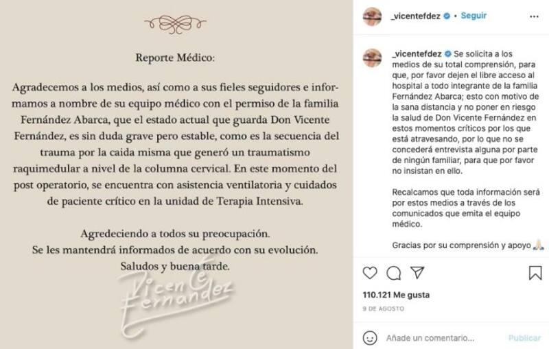 Además, reportaron que don Vicente Fernández seguía en terapia intensiva, despierto, con una traqueostomía y que se le alimentaba por medio de una sonda. Anunciaron que la recuperación de su movilidad sería muy lenta.