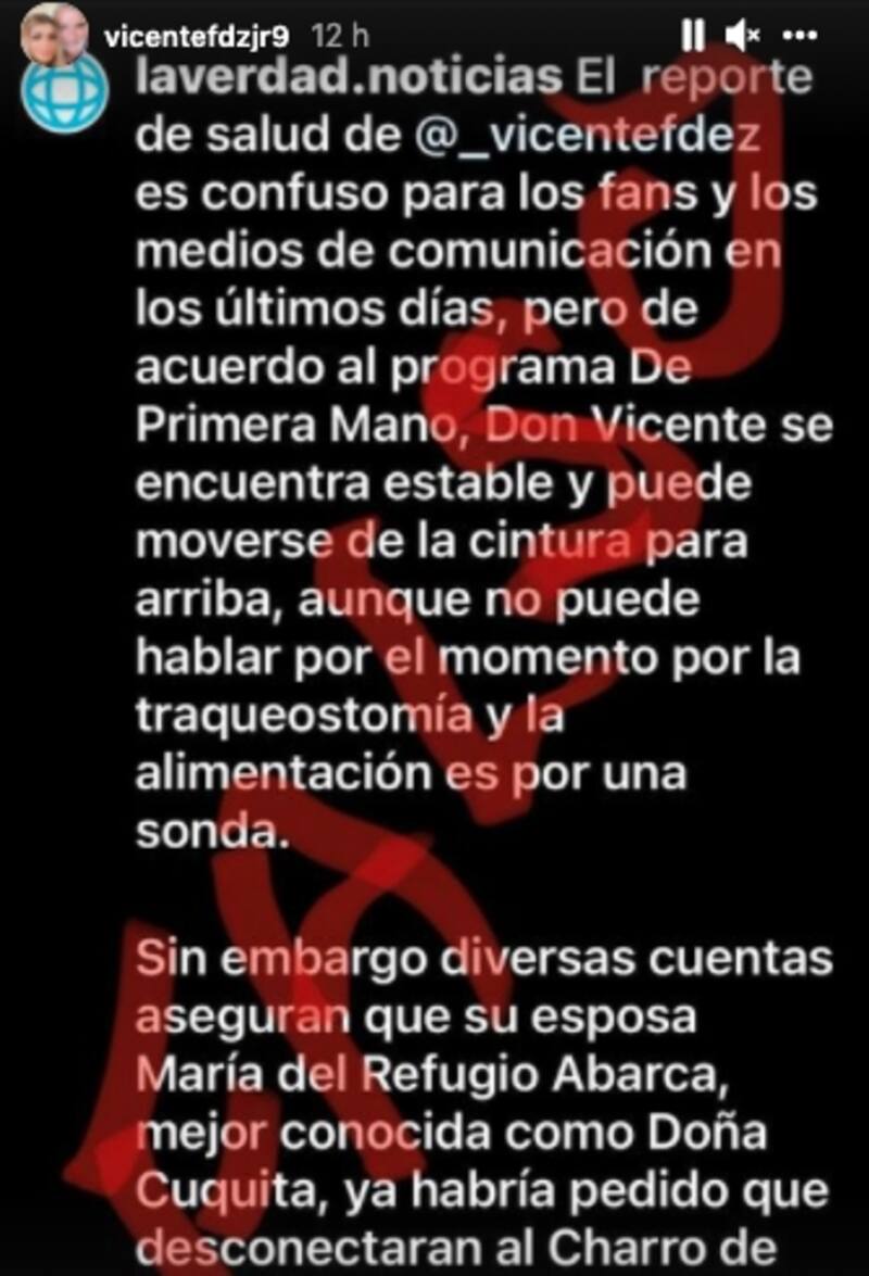 Recientemente, se especuló sobre la posibilidad de que el cantante estuviera desahuciado, lo que molestó fuertemente a sus hijos, en especial a Vicente Fernández Jr., quien a través de una Instagram Storie desmintió la información difundida por el sitio Laverdad.noticias.