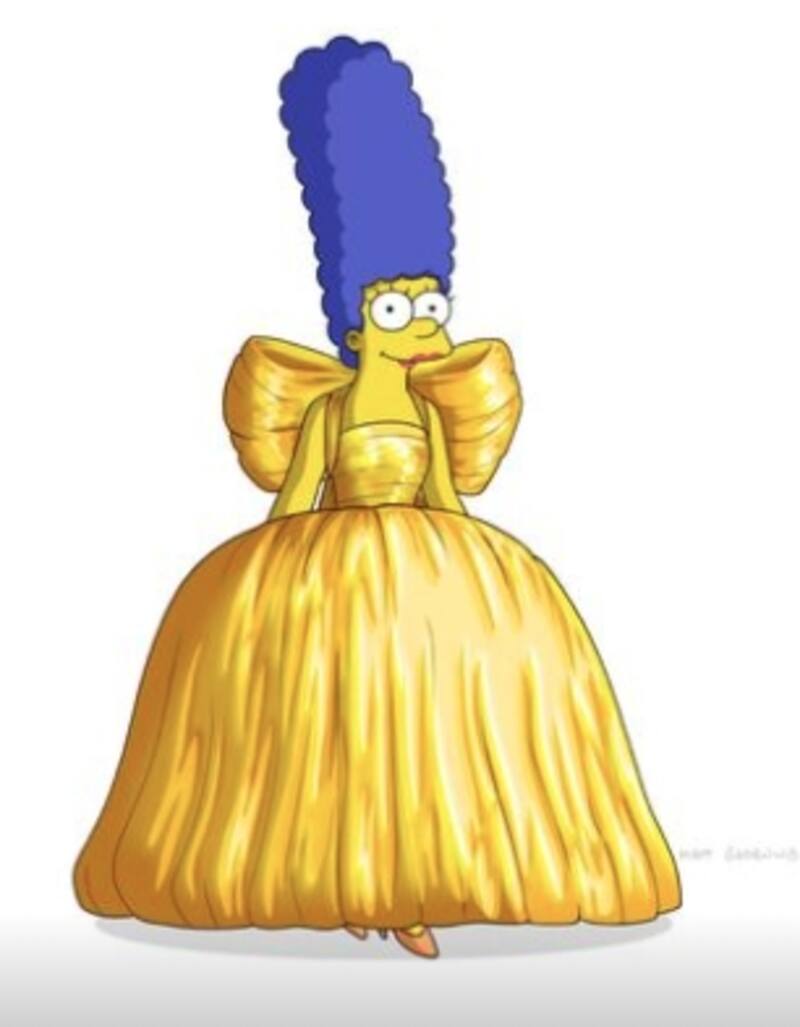 Pero una vez en la sala, una pantalla de cine se iluminó para comenzar a proyectar un capítulo original de la mítica serie de dibujos animados, en el que Homero Simpson trata de cumplir el sueño de su esposa Marge, regalándole un vestido de Balenciaga por su cumpleaños.