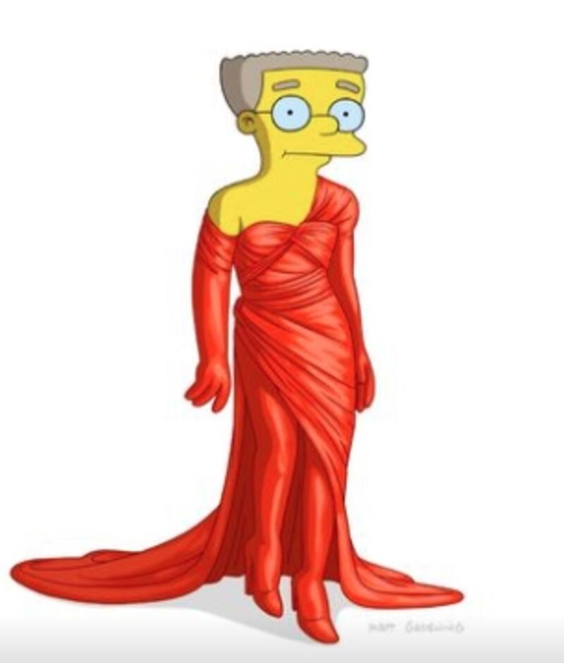 "¿Desfilar en una pasarela? Qué superficial. Bueno, sólo esta vez, por la investigación", dice Lisa Simpson, la aplicada hija del matrimonio Simpson con un vestido rojo de falda de vuelo y su tradicional collar de perlas.
