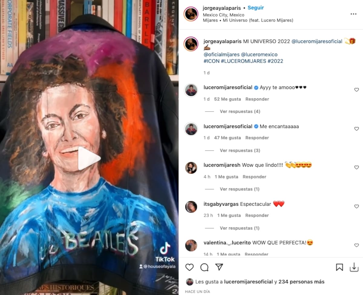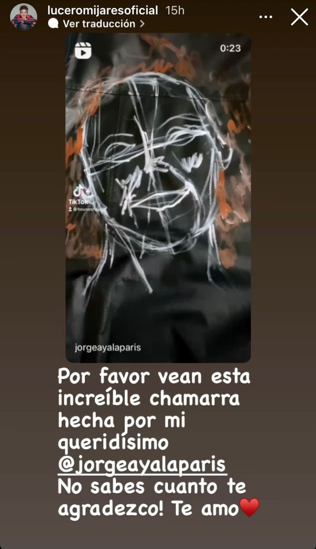 En la publicación compartida en sus Instagram Stories, Lucerito Mijares escribió: "Por favor vean esta increíble chamarra hecha por mi queridísimo @jorgeayalaparis No sabes cuanto te agradezco! Te amo".