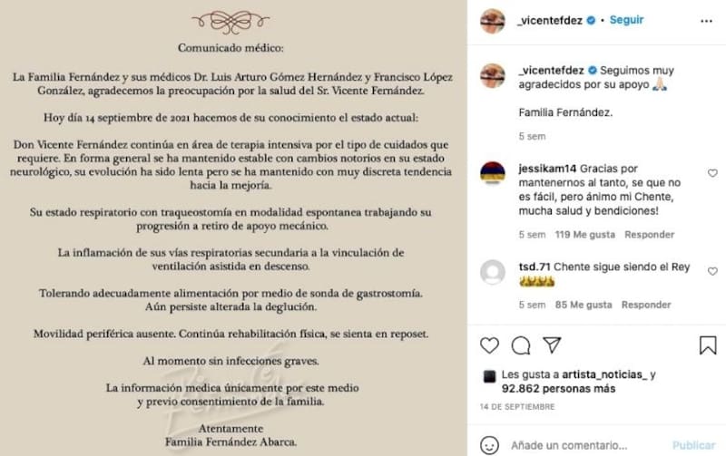 En el comunicado médico oficial compartido en la cuenta oficial de Instagram del ídolo de regional mexicano, se da a conocer la información oficial, se dice que "Don Vicente Fernández continúa estable, más alerta y cooperador en la terapia de rehabilitación. Su esfuerzo respiratorio continúa siendo débil por lo cual requiere soporte en forma intermitente".