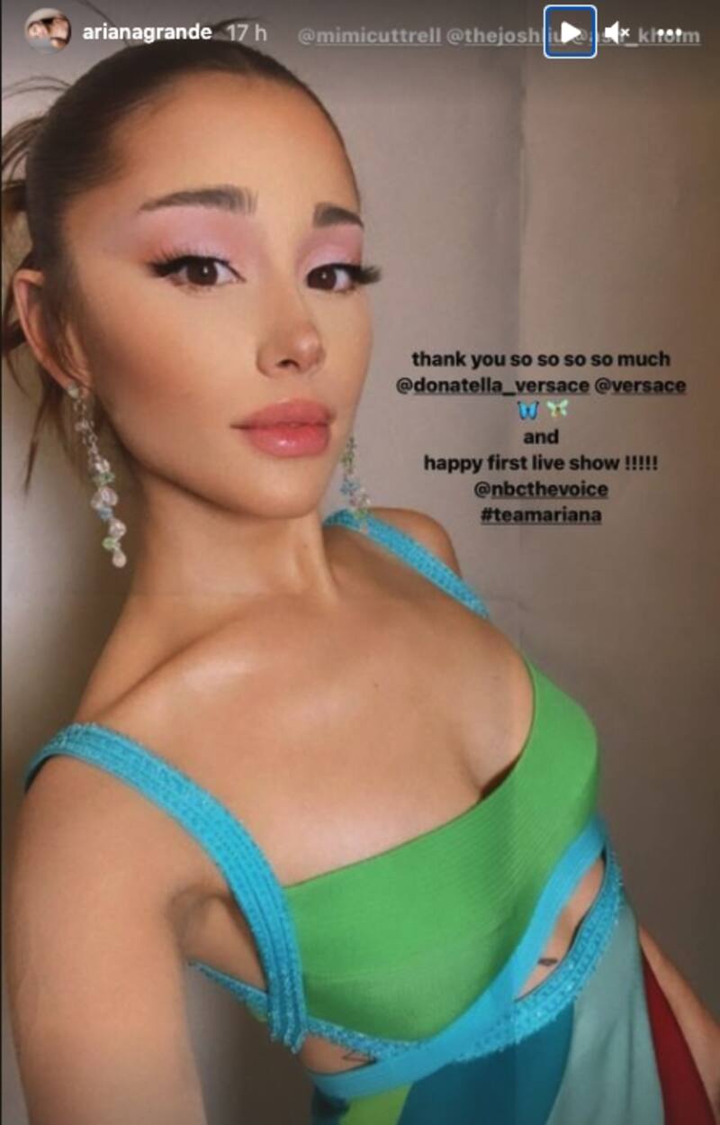 A propósito, a través de sus Instagram Stories, Ariana Grande agradeció a todos los que hicieron posible su look, entre ellos la famosa diseñadora Donatella Versace, quien incluso compartió la fotografía de la cantante en su Instagram y escribió: "¡Mi hermosa chica @arianagrande en Versace SS03 para su primer show en vivo de The Voice!".