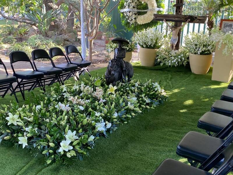 A su alrededor luce una alfombra de pasto artificial y destaca un cristo de tamaño natural, así como macetones con una variedad de flores en color blanco, coronas fúnebres y en un lugar especial, destaca el retrato en blanco y negro de Vicente Fernández sonriente y con sombrero.