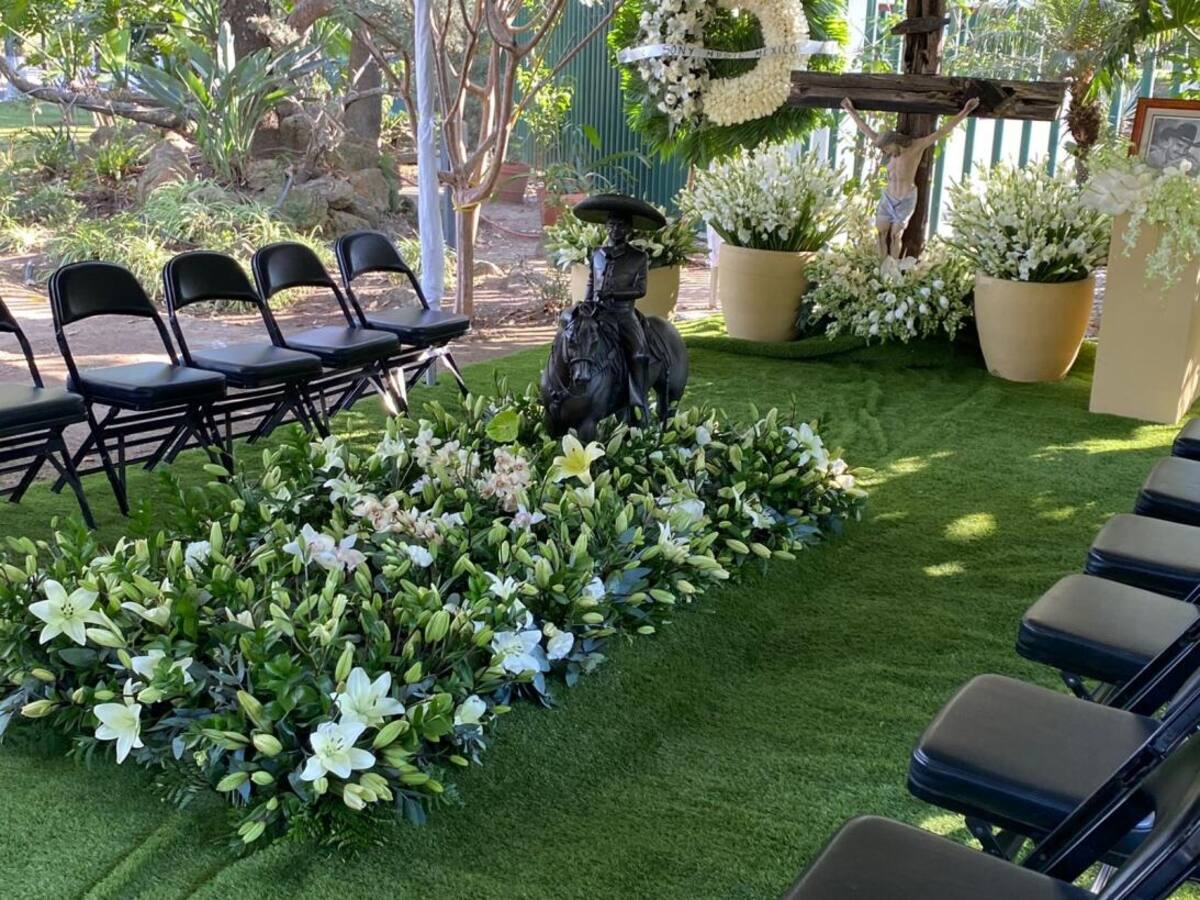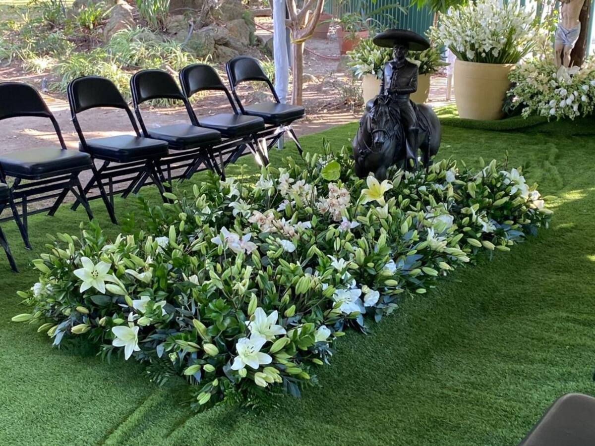 De acuerdo con imágenes que muestra el sitio univision.com, sobre el sepulcro del intérprete de "Las llaves de mi alma" se colocó infinidad de flores tipo Casablanca, así como la escultura en bronce de un hombre montando a caballo que, se presume, es del propio astro de la música vernácula en su etapa joven.