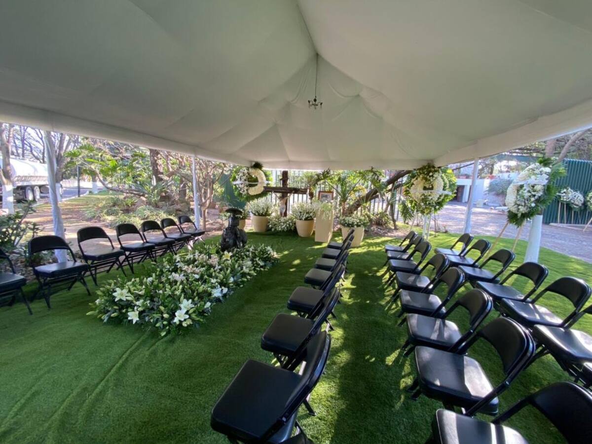 A su alrededor luce una alfombra de pasto artificial y destaca un cristo de tamaño natural, así como macetones con una variedad de flores en color blanco, coronas fúnebres y en un lugar especial, destaca el retrato en blanco y negro de Vicente Fernández sonriente y con sombrero.