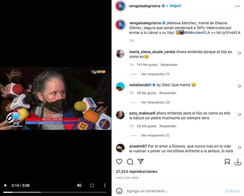 También, la señora Melissa Sánchez puntualizó que Teffy Valenzuela solo quería a su hijo por interés. Las declaraciones de la mamá de Eleazar Gómez provocaron el desacuerdo tanto de los presentadores de "Venga La Alegría", Flor Rubio y Horacio Villalobos, así como de diferentes usuarios.