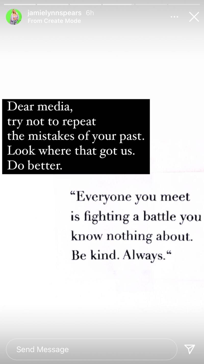 Jamie Lynn escribió un mensaje apoyando a su hermana, Britney Spears, del escrutinio adicional de los medios después de que el documental revelara la manera en que la prensa trató a la estrella del pop en los 2000.