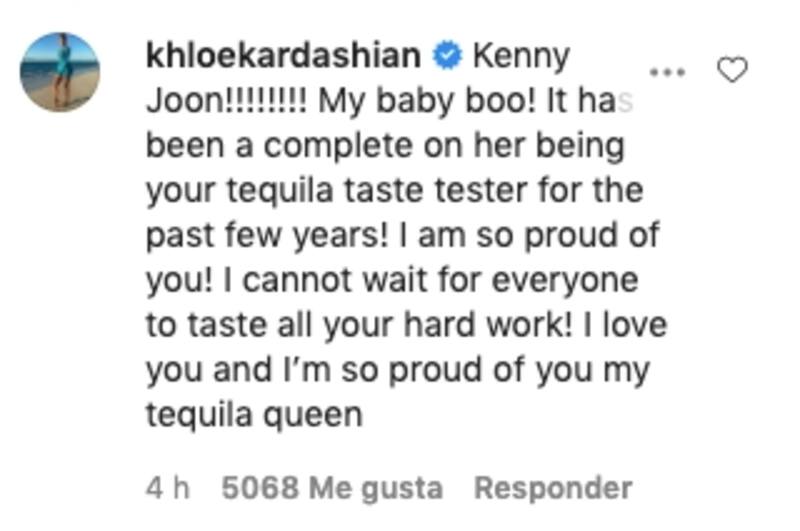 También, Khloé Kardashian comentó la publicación: "Kenny Joon !!!!!!!! ¡Mi bebé Boo! ¡Ha sido un completo que ella sea su probadora de sabor de tequila durante los últimos años! ¡Estoy tan orgullosa de ti! ¡No puedo esperar a que todos prueben todo tu arduo trabajo! Te amo y estoy tan orgulloso de ti mi reina del tequila".