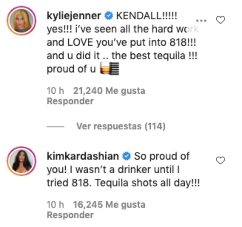 Por un lado, Kylie Jenner comentó: "KENDALL !!!!! ¡¡¡sí!!! ¡¡¡He visto todo el trabajo duro y el AMOR que pusiste en el 818 !!! y lo hiciste .. el mejor tequila !!! orgullosa de ti 🥃 ".