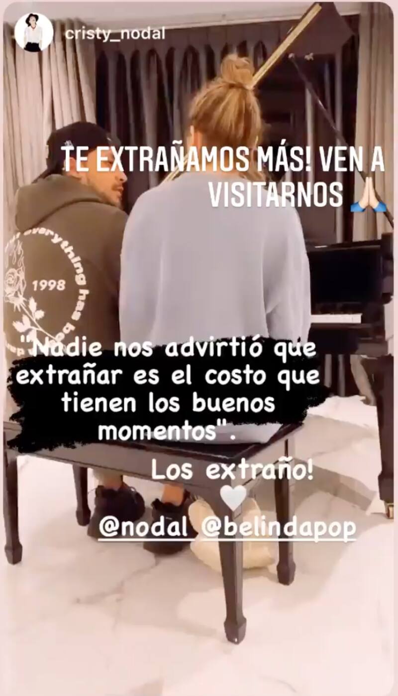 En el video escribió: "Nadie nos advirtió que extrañar es el costo que tienen los buenos momentos. Los extraño @nodal @belindapop".  A dicho mensaje, Belinda replicó y respondió la historia con un: "Te extrañamos más! Ven a visitarnos🙏🏼".