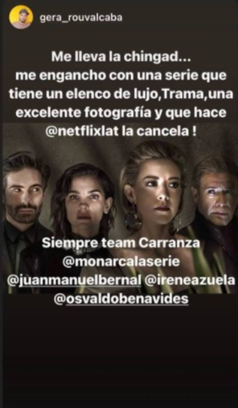 "Hay historias que terminan aunque no concluyan. Así #monarca que para mi es inolvidable. Una colaboración con gente que admiro, un set lleno de humor y respeto, un cast cariñoso y un crew de primera... Me quedo con la satisfacción de que hicimos una serie de calidad para presumir aquí y en otros países. Ahora nos toca inventarnos un final, a ustedes que la vieron y a nosotros que la hicimos. #adiosmonarca #queseradeloscarranza Gracias"