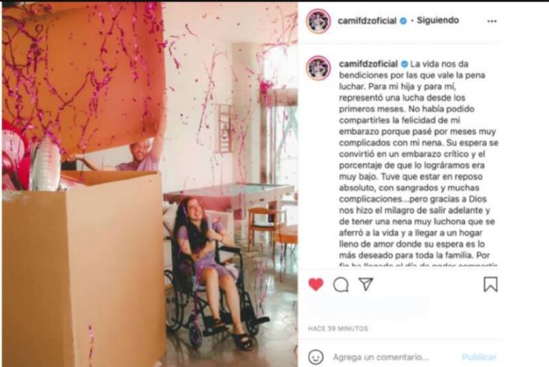 Hace un par de meses, Camila Fernández posteó una fotografía en Instagram que fue capturada durante el gender reveal de su bebé en la que se le observa en silla de ruedas, mientras su esposo destapa una caja llena de globos y serpentinas rosas en seña de que su bebé será niña.