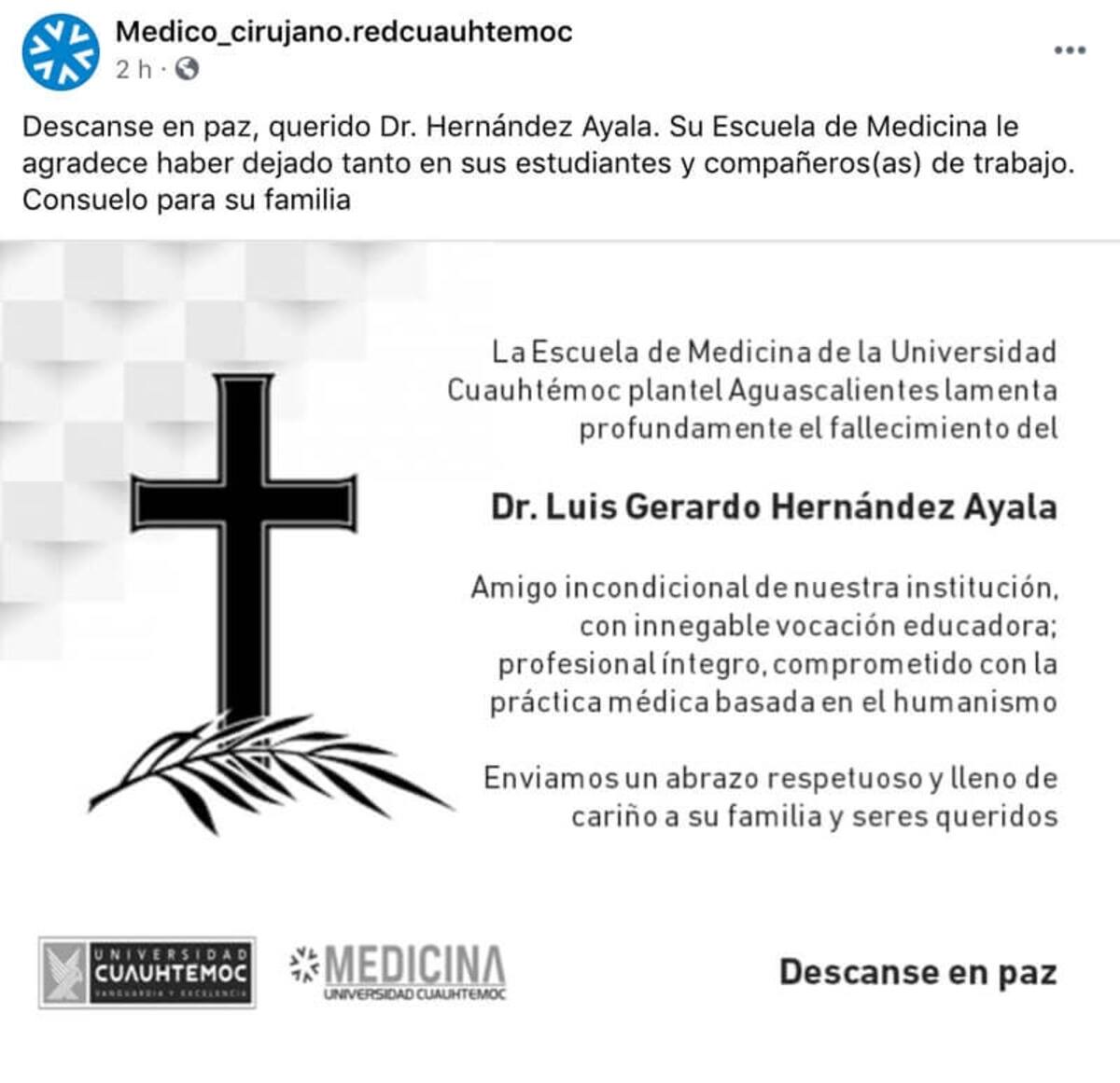 "La Escuela de Medicina de la Universidad Cuauhtémoc plantel Aguascalientes lamenta profundamente el fallecimiento del Dr. Luis Gerardo Hernández Ayala. Amigo incondicional de nuestra institución con innegable vocación educadora; profesional, íntegro, comprometido con la práctica médica basada en el humanismo", se lee en el texto.