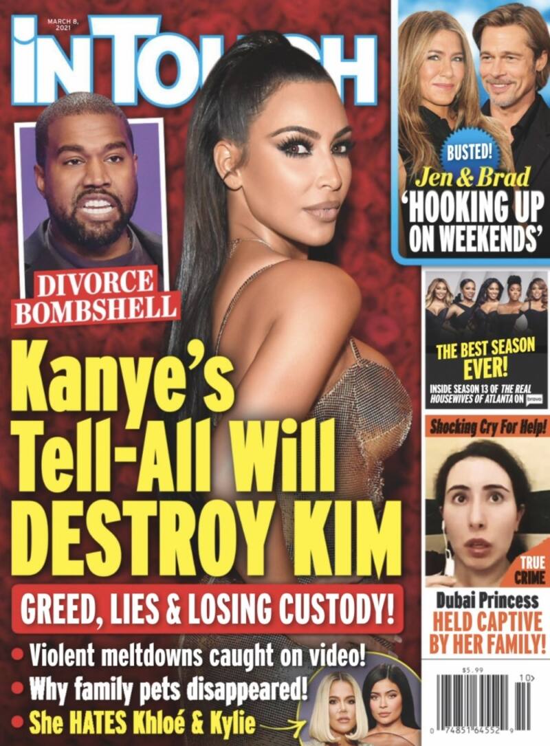 La revista In Touch Weekly afirmó en su última edición que "Kanye destruirá a Kim", ya que, según dijo un informante, "conoce todos sus secretos y sus neurosis. Esto la va a destruir". En su plan por desprestigiar a su ahora ex esposa, el rapero está determinado a que el mundo sepa quién es ella verdaderamente y ya ha comenzado a comentar en voz alta que "tiene serios problemas de ira".