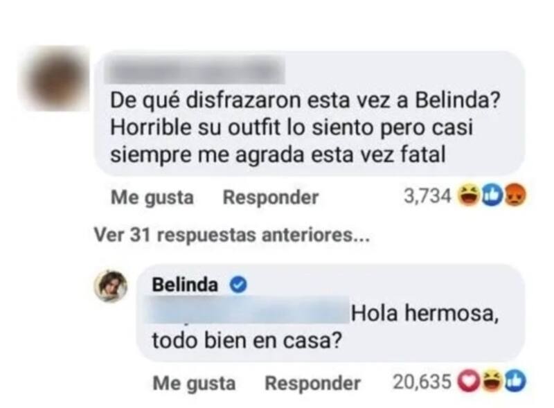 Pero hubo una internauta que no fue amable y se lanzo contra la cantante: "De que disfrazaron esta vez a Belinda? Horrible su outfit" escribió.