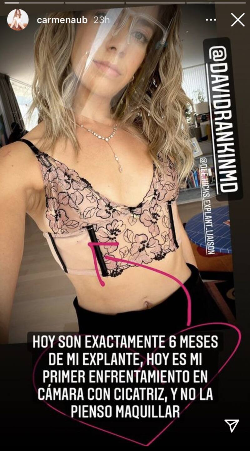 "Hoy son exactamente 6 meses de mi explante. Hoy es mi primer enfrentamiento en cámara con cicatriz y no la pienso maquillar", publicó en sus historias de Instagram.