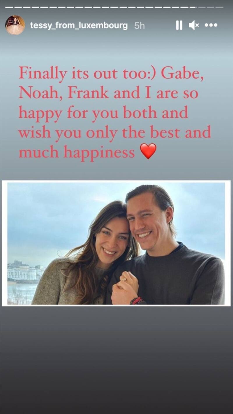 Tessy Antony compartió un mensaje de felicitaciones en su historia de Instagram el martes. "Finalmente también está disponible. Gabe, Noah, Frank y yo estamos muy felices por los dos y les deseamos lo mejor y mucha felicidad", escribió junto con un retrato de la pareja.