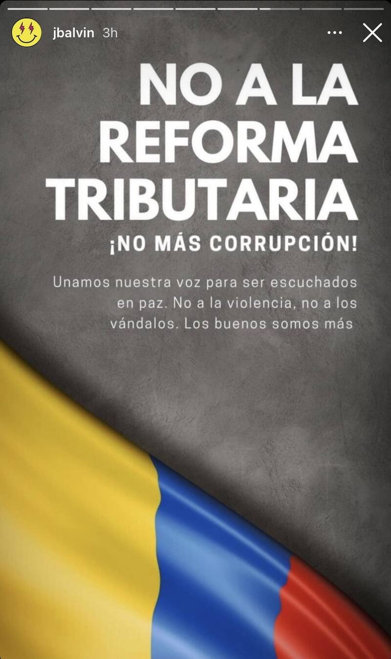 J Balvin demostró su descontento ante esta situación, expresando su rechazo en su cuenta de Instagram a la reforma tributaria, pero enfatizó las acciones violentas en algunas ciudades, y añadió que la prioridad es cuidar la salud en medio de la emergencia sanitaria por el Covid-19.