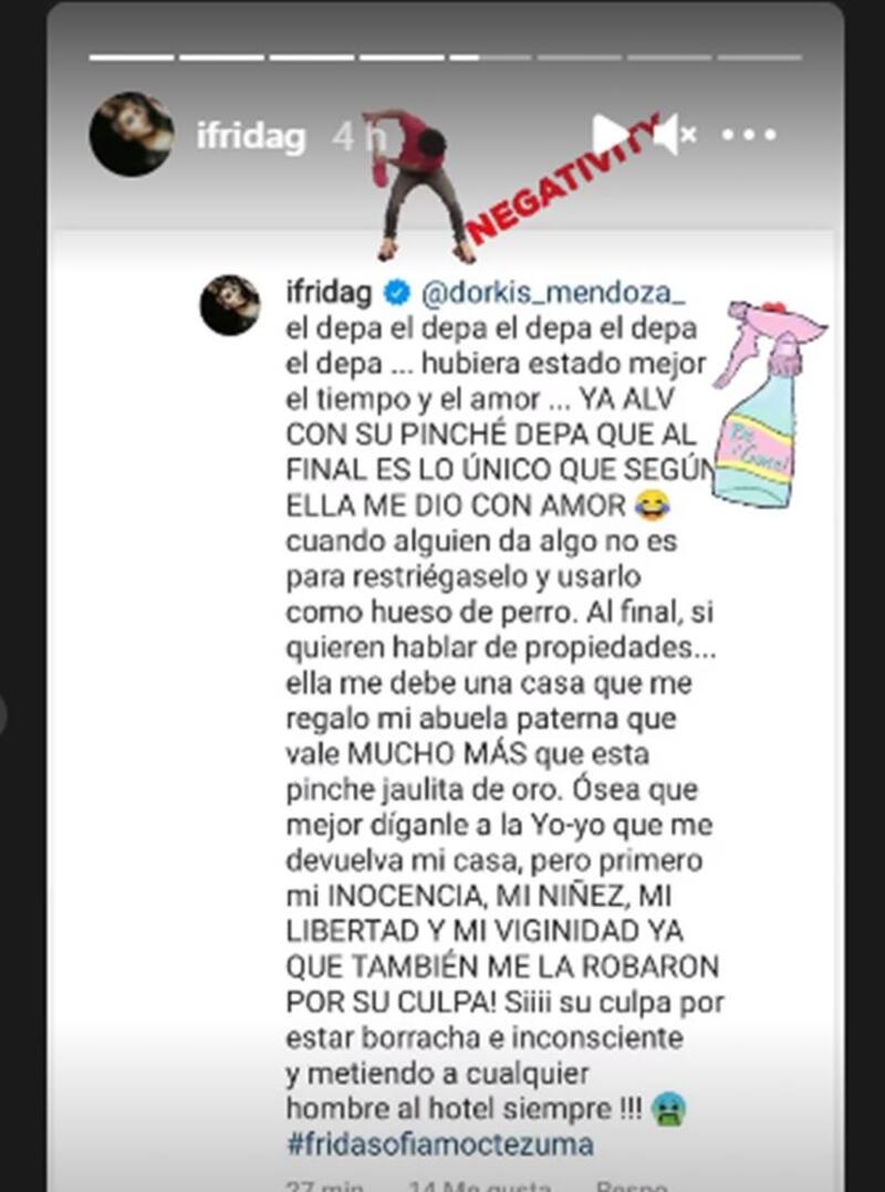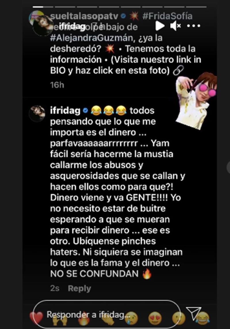 Ante ello, Frida Sofía respondió a las críticas de manera contundente, y afirmó que a ella no le importa el dinero ni estar en la herencia de su mamá. "Todos pensando que lo que me importa es el dinero, por favor: fácil sería hacerme la mustia, callarme los abusos y asquerosidades que se callan y hacen ellos, ¿cómo para qué?. Dinero viene y va gente, yo no necesito estar de buitre esperando a que se mueran para recibir dinero, ese es otro. Ni siquiera se imaginan lo que es la fama y el dinero, no se confundan", escribió en una de sus historias.