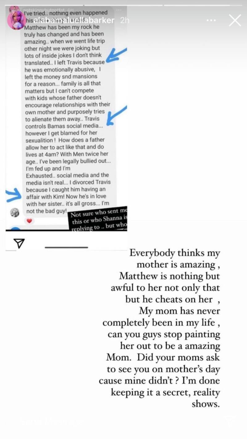 Junto a su mensaje, Alabama, de 15 años, compartió una captura de pantalla de un mensaje directo supuestamente escrito por Shanna Moakler que decía en parte: "¡Me divorcié de Travis porque lo atrapé teniendo una aventura con Kim! Ahora está enamorado de su hermana... Todo es asqueroso... ¡No soy la malo!".