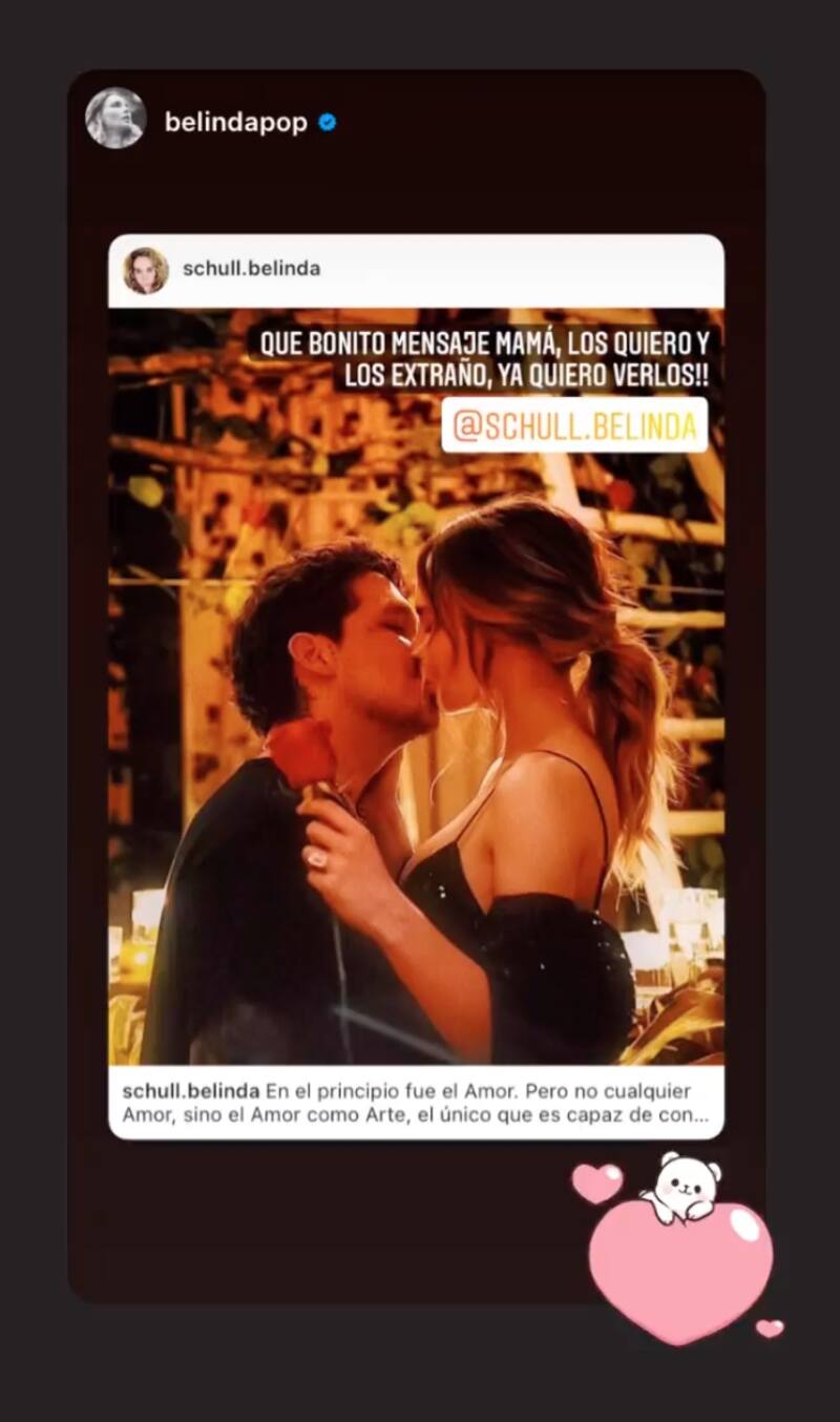 Por su parte, la mamá de la intérprete de "Bella Traición", Belinda Schull, recientemente compartió en su cuenta de Instagram, una fotografía de la pareja recién comprometida, en la que dedicó un hermoso mensaje a los enamorados.