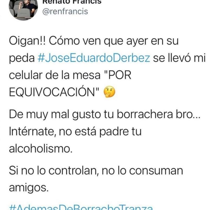 "Oigan, cómo ven que ayer en su pe… José Eduardo Derbez se llevó mi celular de la mesa 'por equivocación'"....De muy mal gusto tu borrachera bro... Intérnate, no está padre tu alcoholismo. Si no lo controlan, no lo consuman amigos", declaró Renato.