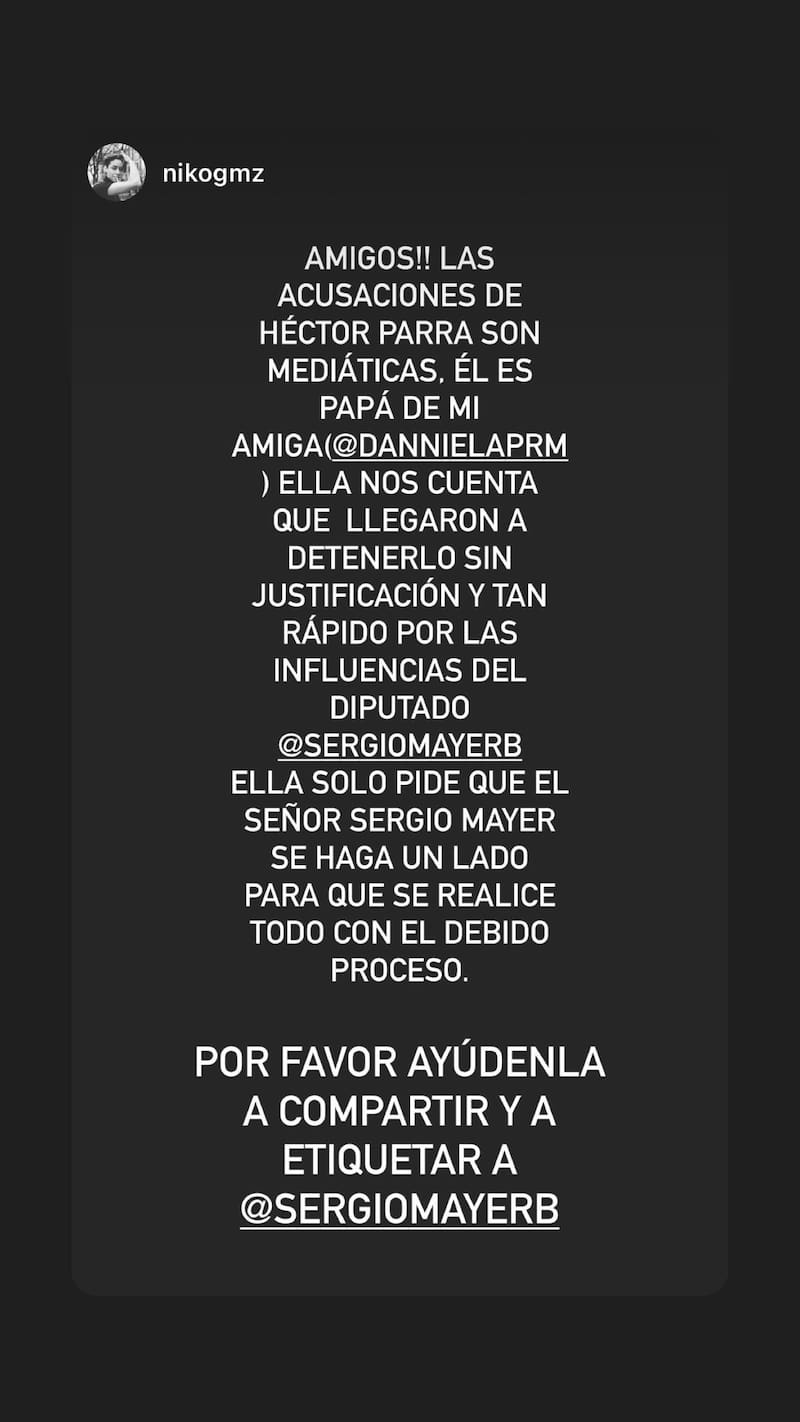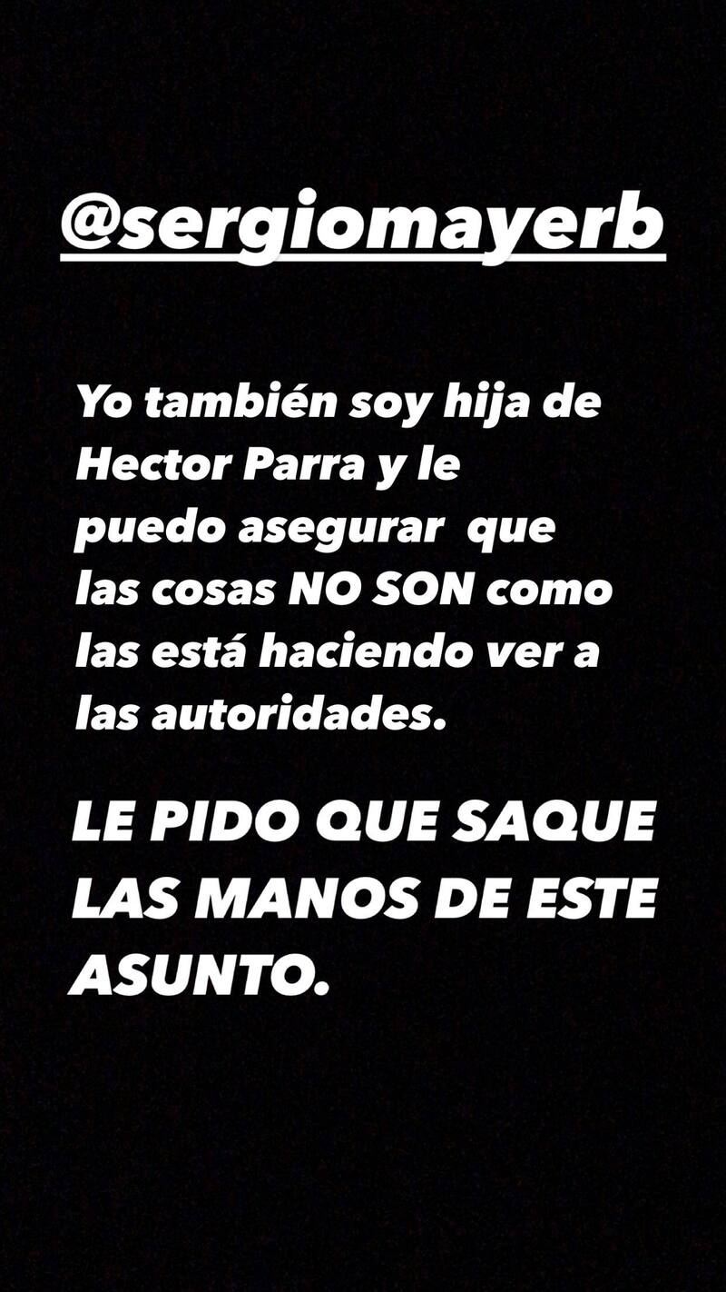 Además, Daniela Parra, a través de Instagram, mandó un mensaje en el que exigió a Sergio Mayer, quien ha estado involucrado en el caso de Héctor 'H', del lado de Ginny Hoffman y su hija, que "saque las manos del asunto", pues solo está perjudicando más a su papá.