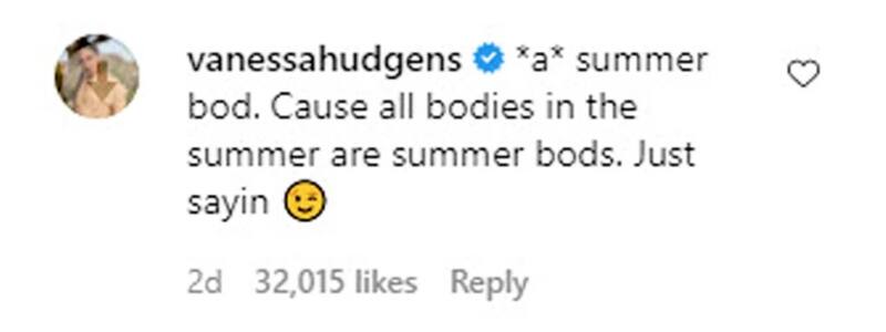 Si bien a casi medio millón de personas les gustó el repost y a más de siete millones les gustó el original, Vanessa Hudgens claramente no era una de ellas. La protagonista de "High School Musical", se encargó de corregir ese texto y ser la voz que hable por todos los diferentes tipos de cuerpo, no sólo los perfectamente tonificados para el verano.