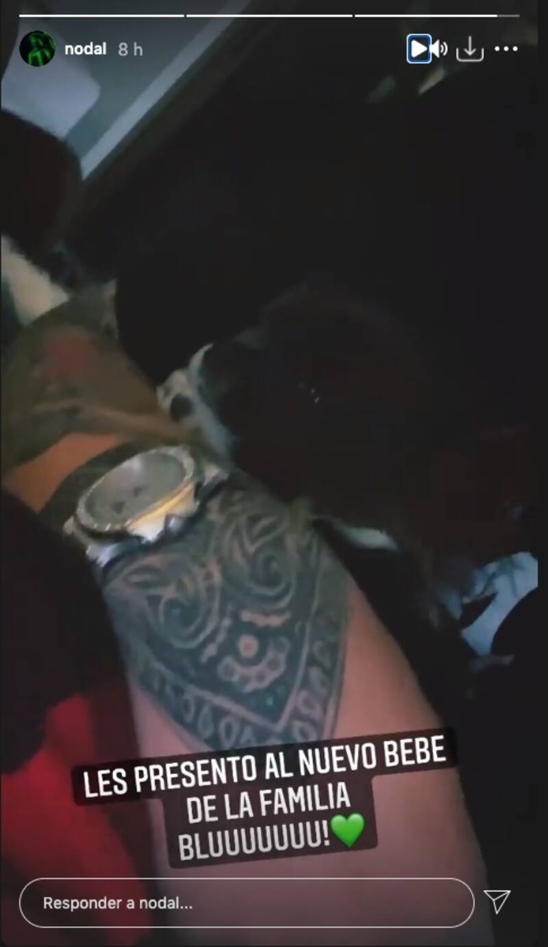Por su parte, Christian Nodal, también publicó un pequeño video en sus Instagram Stories, en el que se alcanza a ver su brazo tatuado y al llamado "Blu", el cantante escribió: "Les presento al nuevo bebé de la familia".