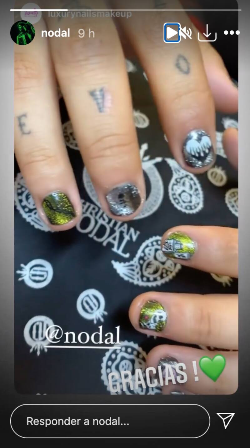Mientras Belinda optó por un diseño sutil en verde pistache, Christian Nodal se decidió por unas uñas más estridentes en plateado y verde metálico, junto con algunas aplicaciones divertidas, acompañando sus dedos con letras tatuadas.