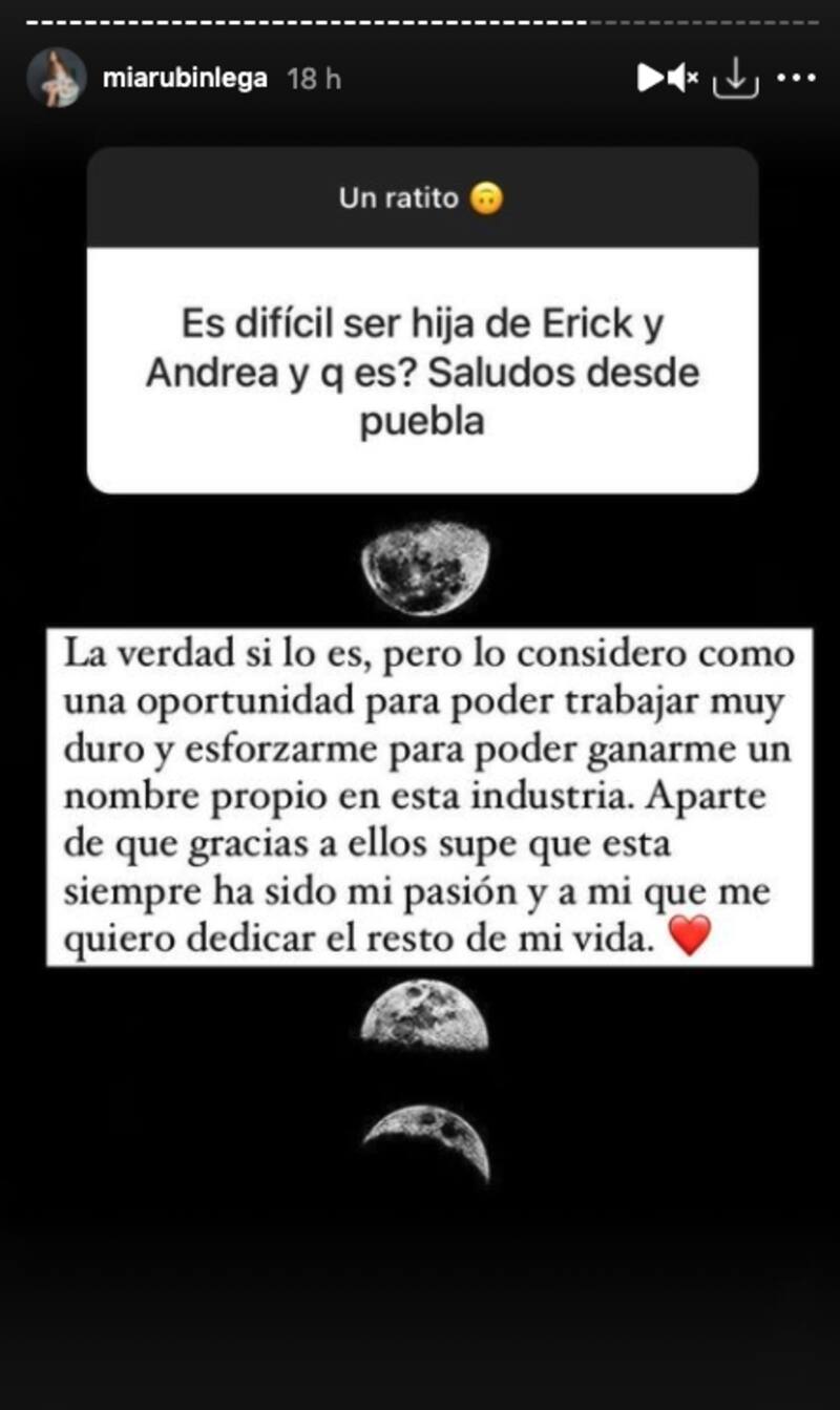 Una de las preguntas más contundentes fue aquella en la que le formularon si es difícil ser hija de la conductora Andrea Legarreta y el cantante Erik Rubín, a lo que contestó contundentemente: "La verdad sí lo es, pero lo considero como una oportunidad para poder trabajar muy duro y esforzarme para poder ganarme un nombre propio en esta industria. Aparte de que gracias a ellos supe que esta siempre ha sido mi pasión y a mi que me quiero dedicar el resto de mi vida", respondió.