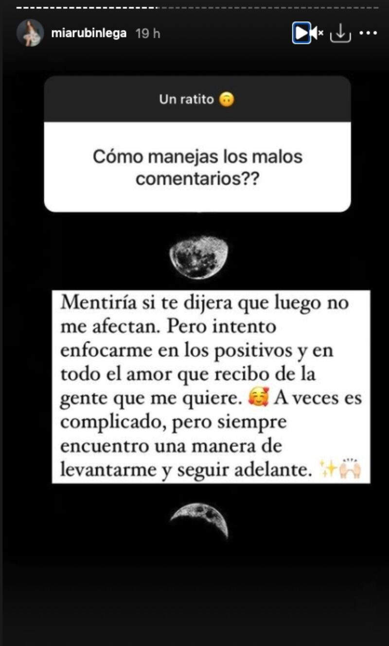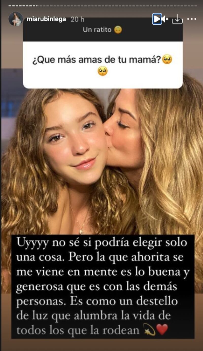 En una dinámica de preguntas en su cuenta de Instagram, Mía Rubín respondió algunas dudas de sus seguidores, entre ellas estuvieron los cuestionamientos sobre qué es lo que más ama de su mamá, a lo que comentó: "Es como un destello de luz que alumbra la vida de todos lo que la rodean".