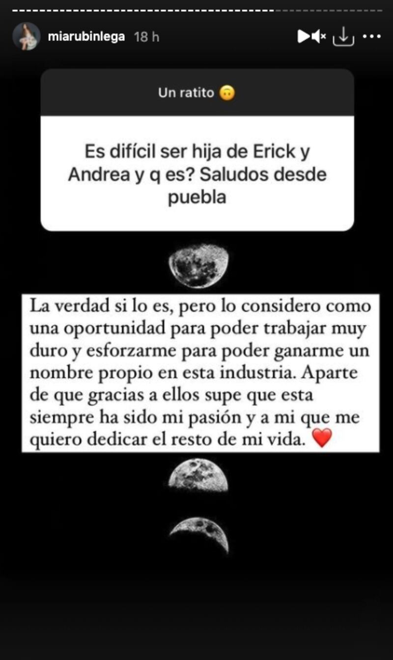 Una de las preguntas más contundentes fue aquella en la que le formularon si es difícil ser hija de la conductora Andrea Legarreta y el cantante Erik Rubín, a lo que contestó contundentemente: "La verdad sí lo es, pero lo considero como una oportunidad para poder trabajar muy duro y esforzarme para poder ganarme un nombre propio en esta industria. Aparte de que gracias a ellos supe que esta siempre ha sido mi pasión y a mi que me quiero dedicar el resto de mi vida", respondió.