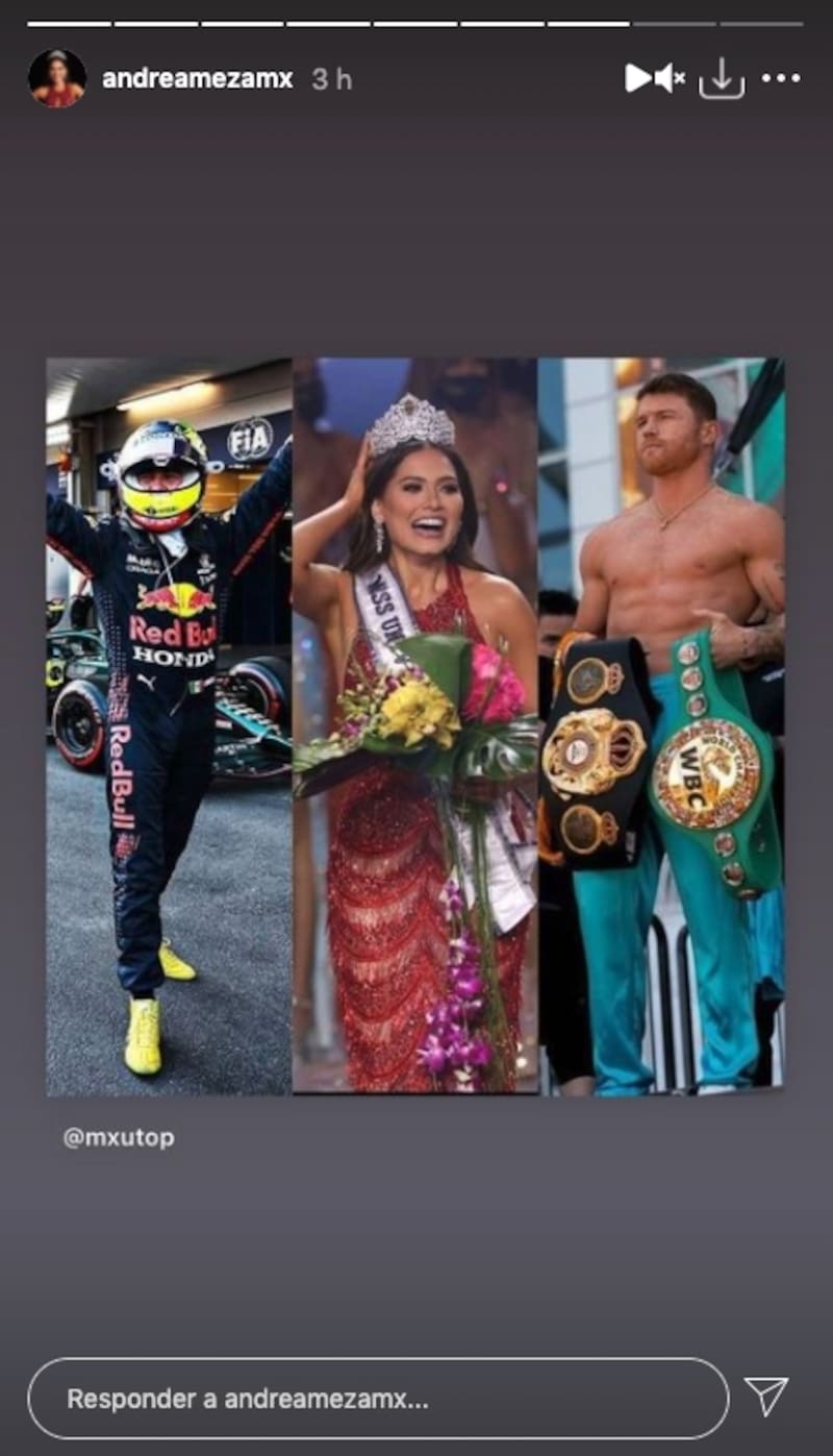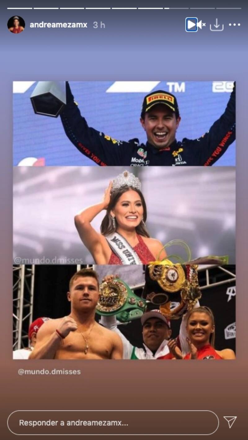 La recién coronada Miss Universo 2020, mostró su poder mexicano, al compartir algunos posteos en los que aparece ella, junto a Checo Pérez y Saúl "Canelo" Alvarez, tres mexicanos que han destacado en los últimos meses en el mundo.