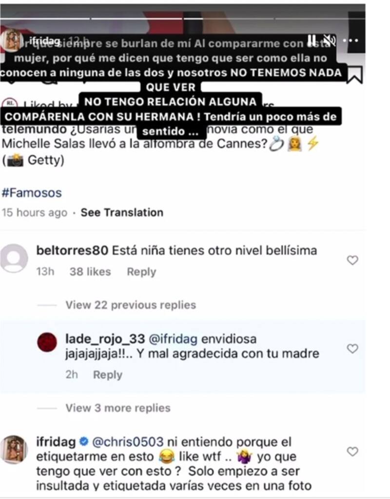 Frida Sofía estalló en redes sociales tras ser comparada con Michelle Salas. En sus stories de Instagram, la famosa modelo criticó los comentarios de algunos seguidores que la cuestionaron sobre su opinión acerca de la hija de Luis Miguel quien lució un vestido blanco de la marca Pronovias.