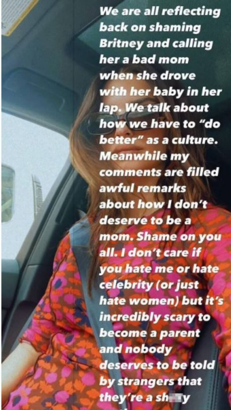 "Todos estamos reflexionando sobre avergonzar a Britney (Spears) y llamarla mala madre", escribió la influencer de 30 años en sus redes sociales.