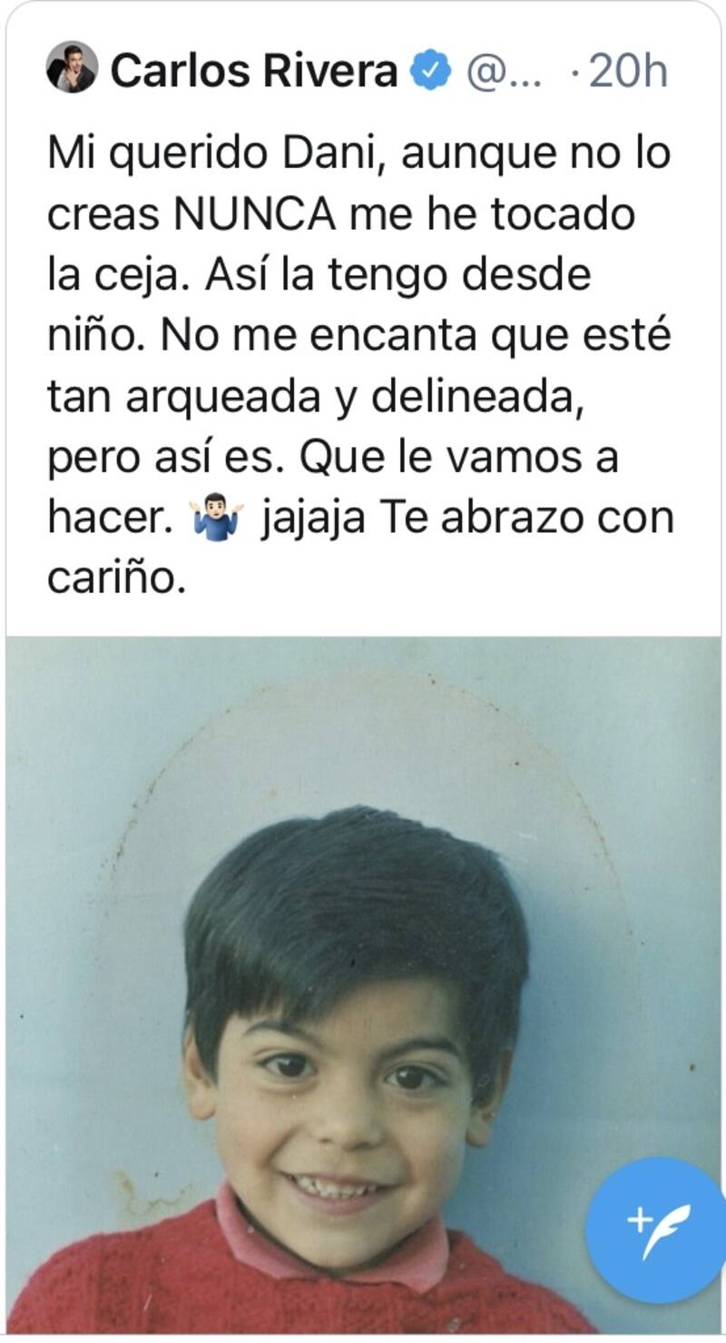 Respuesta que propició que el debate siguiera en las redes, ante esto, Carlos Rivera se defendió y le contestó al periodista y actor, con una imagen de su infancia en la que porta un suéter rojo y se ve que siempre ha tenido esa marcada ceja. Lo que desarmó a Daniel Bisogno, quien no dijo nada más.