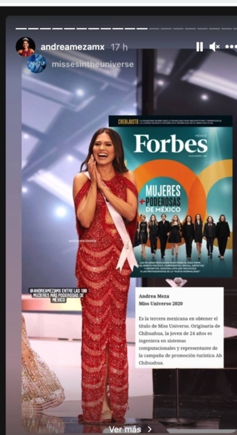 "Es la tercera mexicana en obtener el título de Miss Universo. Originaria de Chihuahua, la joven de 24 años es ingeniera en sistemas computacionales y representante de la campaña de promoción turística Ah Chihuahua", agregó Forbes como breve semblanza de Andrea Meza.