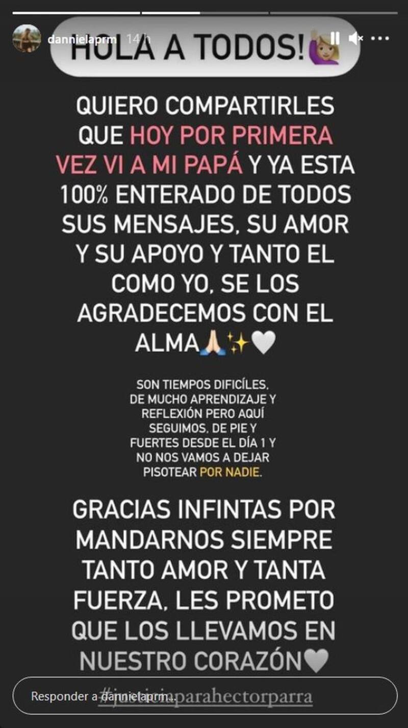 Mediante sus insta stories, Daniela Parra reveló que tras la detención por fin pudo ver a su papá. "Quiero compartirles que hoy por primera vez vi a mi papá y ya esta 100% enterado de todos sus mensajes, su amor y su apoyo y tanto él como yo se los agradecemos con el alma", escribió.