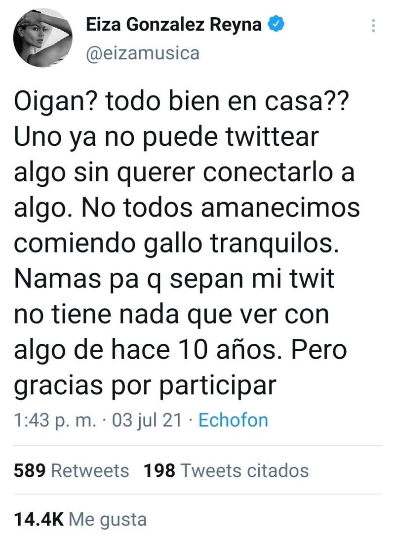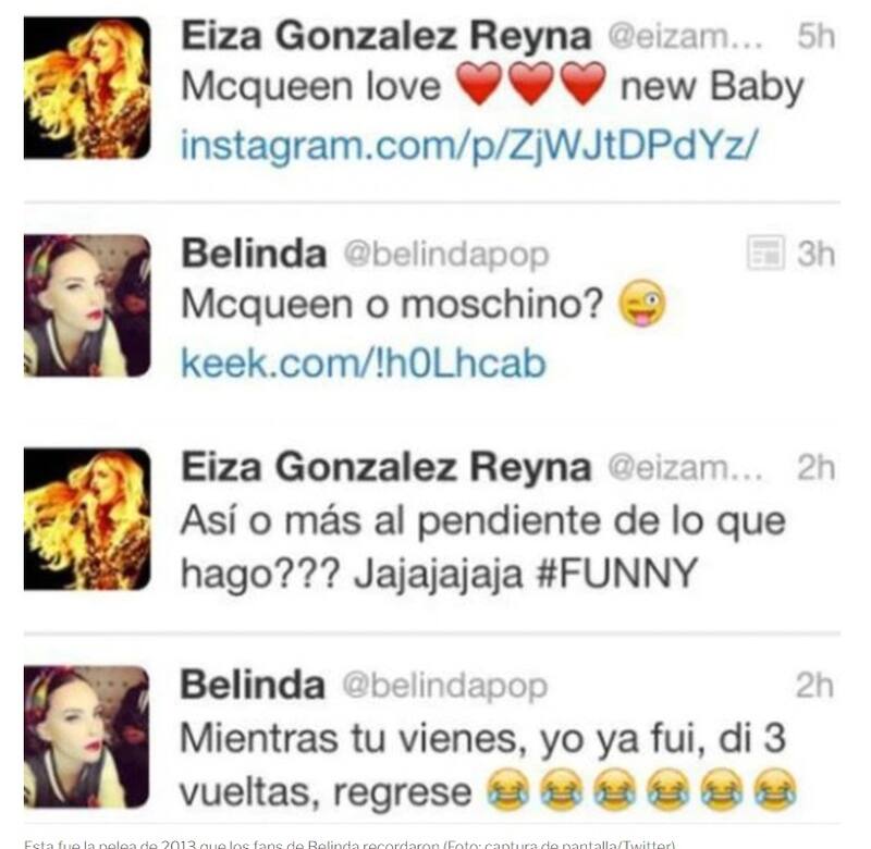 Las críticas de los "Beli Fans", le llovieron a la también cantante, pues, aunque Eiza negó rotundamente con otro tuit que su mensaje estuviera dedicado a Belinda, la memoria de internet y las capturas de pantalla de aquella discusión, ponen en duda las palabras de la actriz.