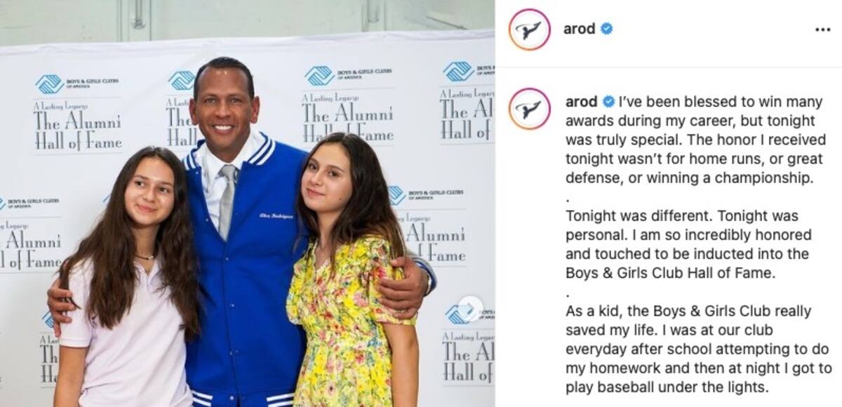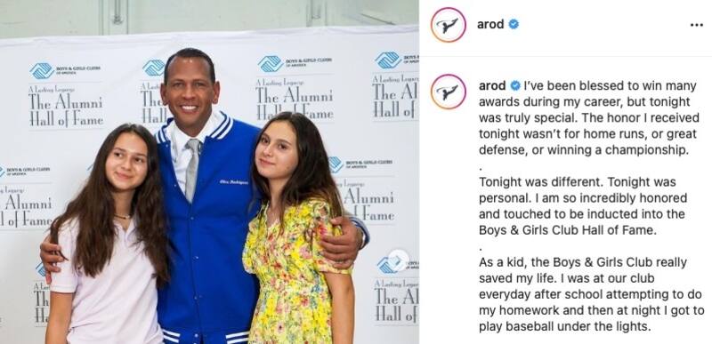 Alex Rodríguez se describe en Instagram como el "orgulloso padre de dos" y lo demuestra constantemente con fotografías en las que se le ve disfrutar con sus hijas Natasha y Ella. En sus publicaciones se puede leer cosas como "Todos los días estoy agradecido. Por mi salud, mi familia, amigos y bendiciones de la vida", o "Agradecido de que mis chicas sigan pensando que soy divertido".
