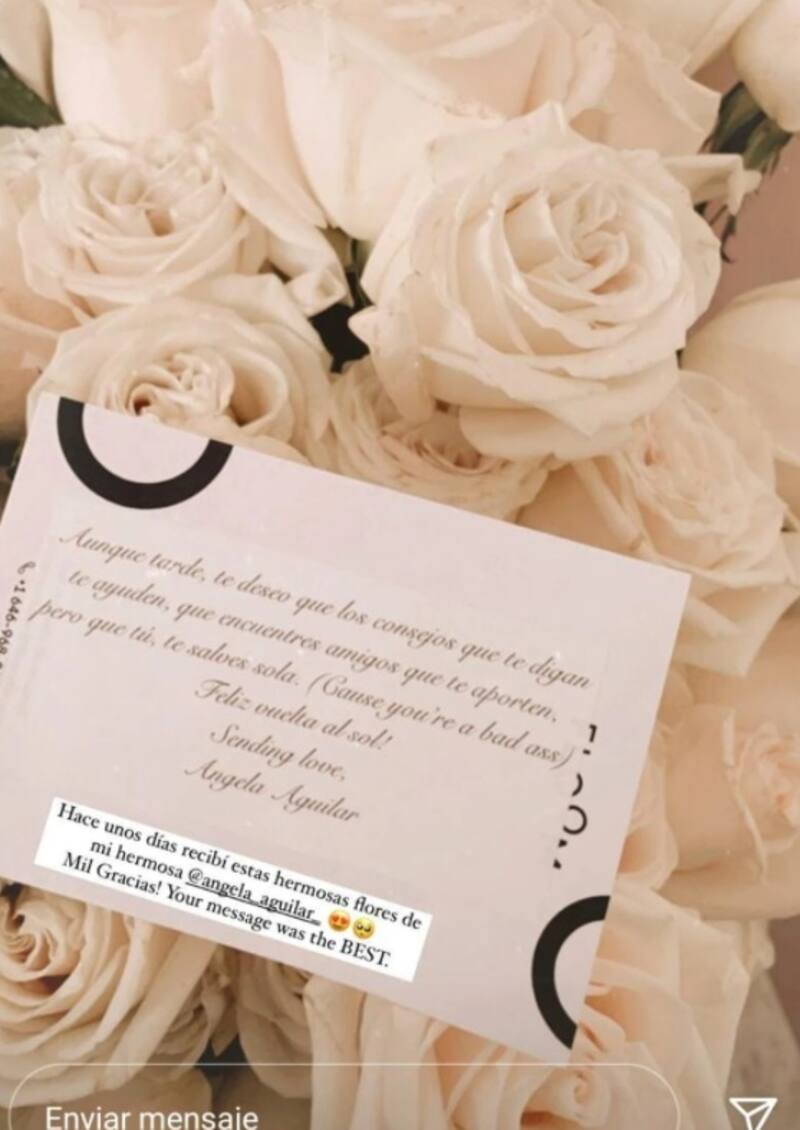 Ángela Aguilar le envió un bello ramo de rosas blancas, acompañado de un emotivo mensaje: "Aunque tarde, te deseo que los consejos que te digan te ayuden, que encuentres amigos que te aporten, pero que tú te salves sola. Cause you're a bad ass (Porque eres una cabr*na). Feliz vuelta al sol! Sending love (con amor), Ángela Aguilar".