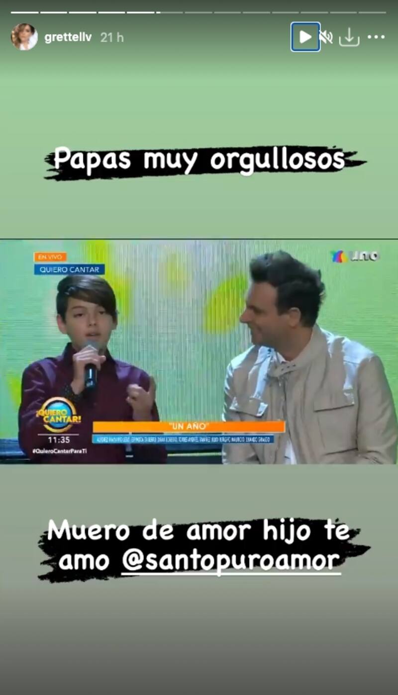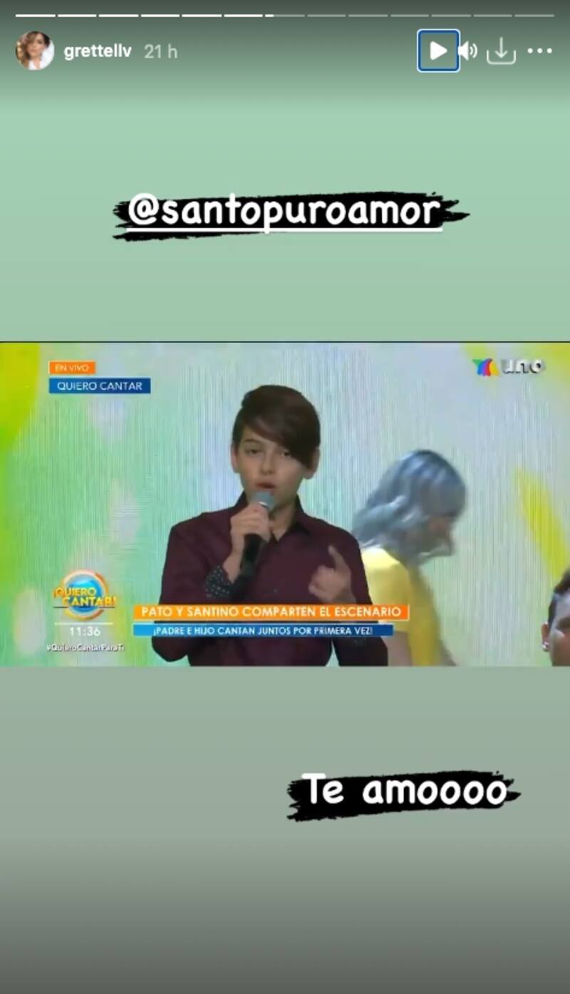Mediante sus Instagram Stories, Grettell Valdez compartió el momento entre Santino y Pato Borghetti, junto con diversas frases como "Papás muy orgullosos. Muero de amor hijo te amo @santopuroamor".