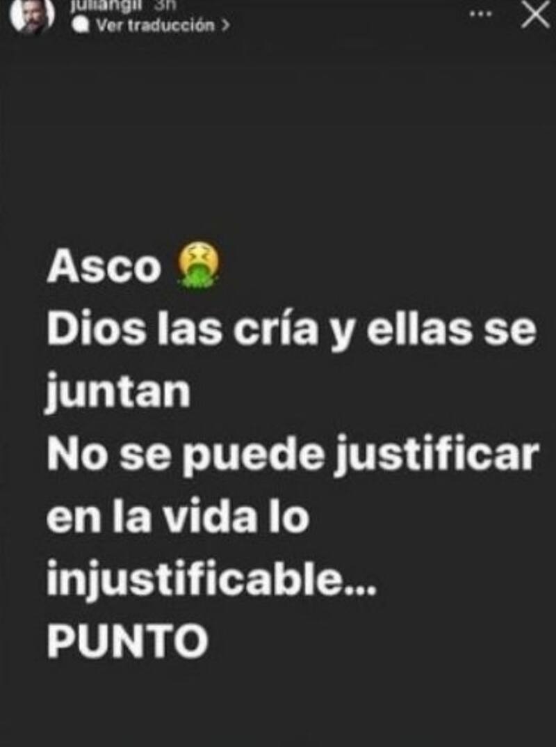 "Asco, Dios las cría y ellas se juntan. No se puede justificar en la vida lo injustificable. Punto", publicó el actor en su cuenta junto a un emoticon que vomita.