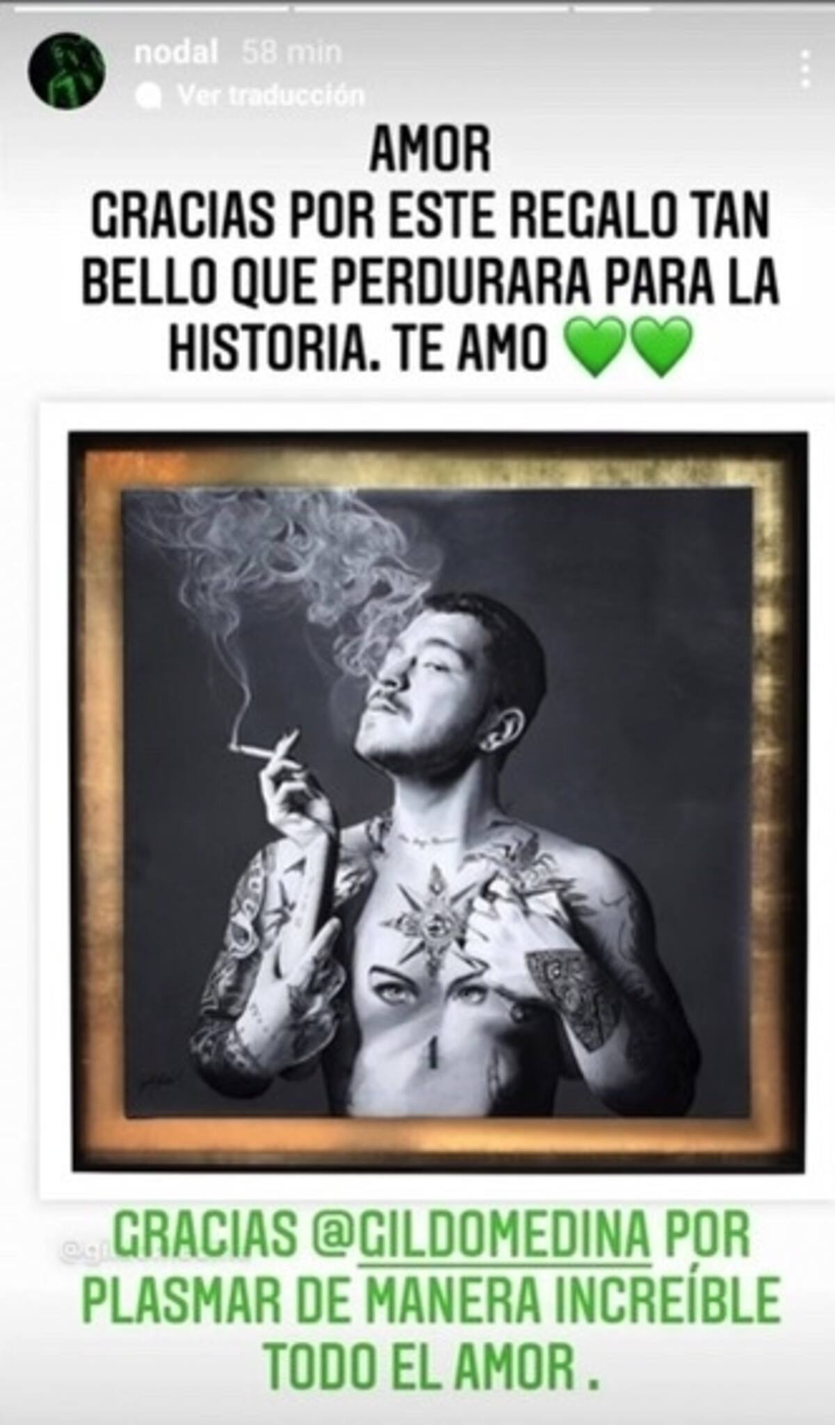 En la pintura, hecha a blanco y negro, se puede apreciar a Christian Nodal de frente, con el torso desnudo y los tatuajes que tanto le caracterizan mientras fuma un cigarrillo. Sin embargo, las manos que sostienen el tabaco son las manos de Belinda, que fueron retratadas con las uñas largas y un esmalte obscuro. Este regalo fue de la cantante para Nodal.