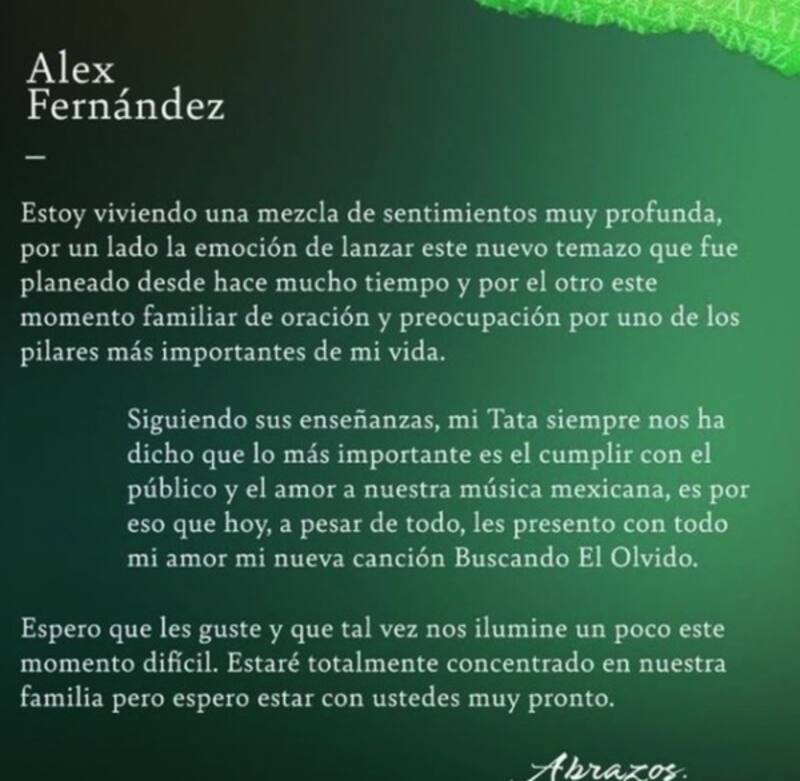En su texto, Alex Fernández se sinceró sobre su situación y aseguró que estaba siguiendo el ejemplo de Vicente Fernández, al poner como prioridad su música y, por supuesto, a sus fans.